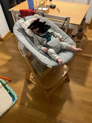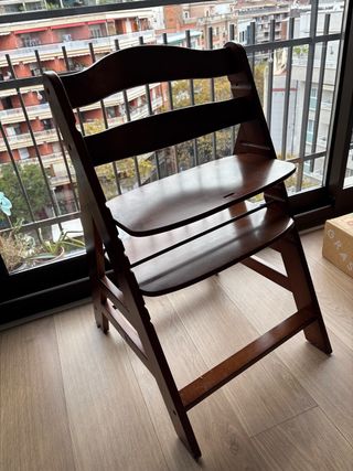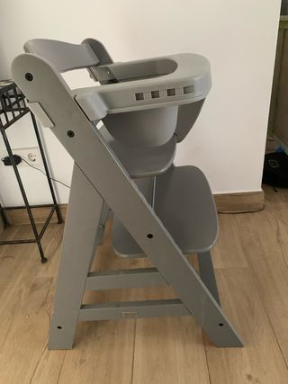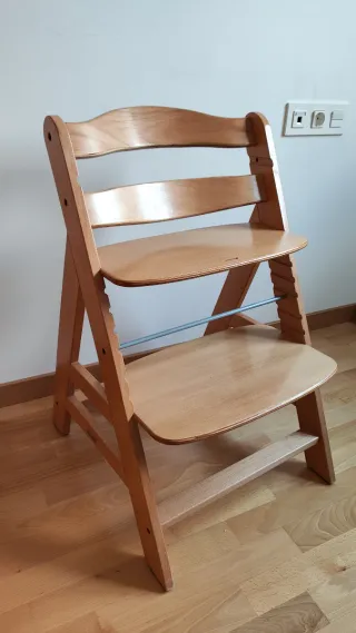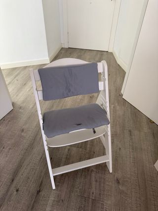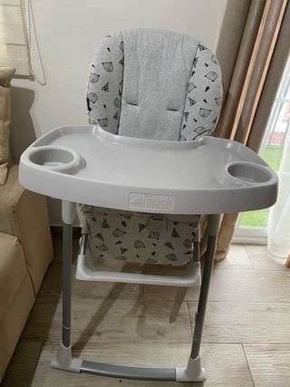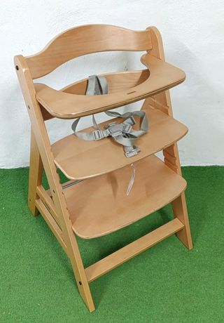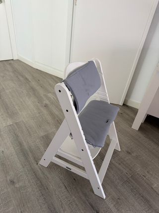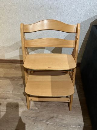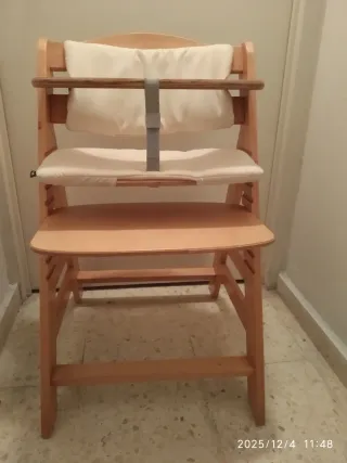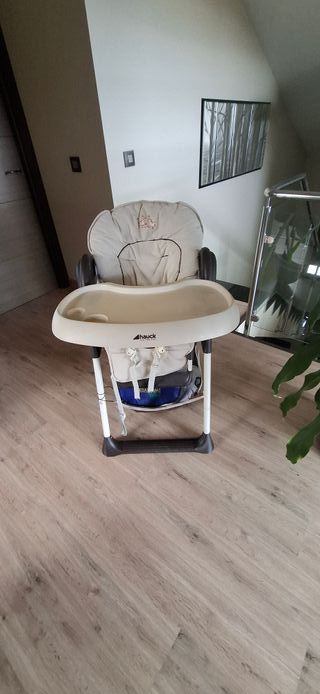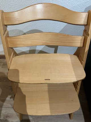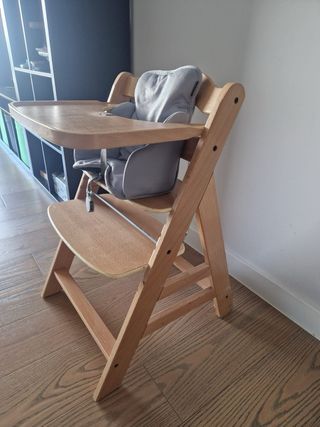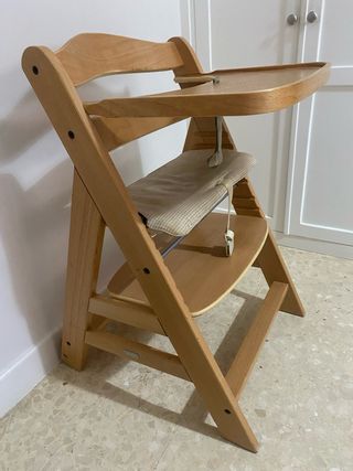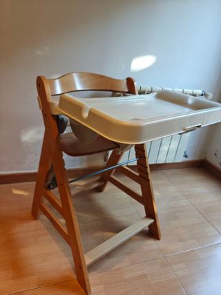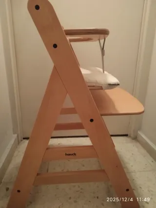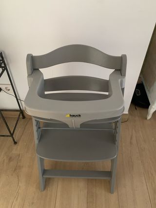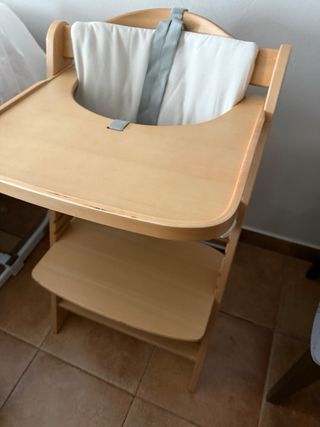 Trona evolutiva de madera de la marca Hauck, ideal para acompañar el crecimiento del bebé. - Fabricada en madera. - Incluye cojín acolchado. - Arnés de seguridad de 5 puntos. - Bandeja extraíble. - Cojín adicional sin utilizar La trona se ha usado unos 3 meses y está en perfecto estado