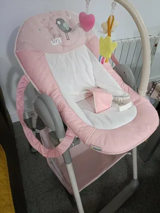 Trona convertible de la marca Hauck, regulable en altura. Primeros meses hamaca con mobil tambien regulable en altura. ideal para los más pequeños. Su diseño es acolchado y cómodo. - Color rosa y blanco. - Incluye arco de juegos con peluches. - Arnés de seguridad de 5 puntos.
