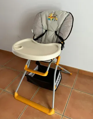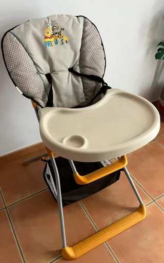 Trona infantil con diseño de Winnie the Pooh y amigos. Ideal para los más pequeños. - Asiento acolchado con estampado de lunares. - Bandeja extraíble. - Arnés de seguridad. - Cesta de almacenamiento inferior. - Estructura metálica con detalles en amarillo.