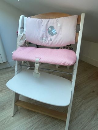 Trona evolutiva Hauck en color blanco, ideal para acompañar el crecimiento del bebé. - Cojín rosa con estampado de topos blancos. - Cojín superior con diseño de pajarito little bird. - Arnés de seguridad.