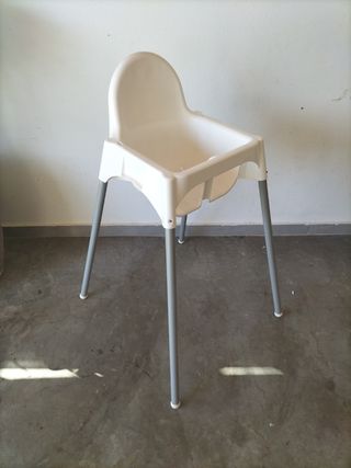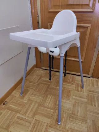 Trona de bebé modelo ANTILOP de IKEA. Es blanca y tiene patas grises. - Bandeja de plástico. - Cinturón de seguridad. Dispongo de 3 unidades.