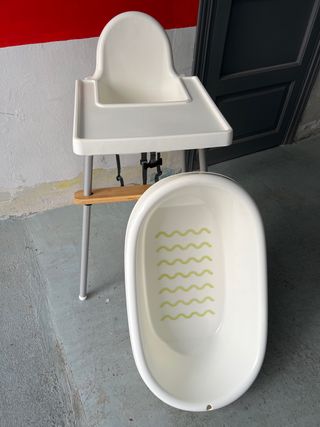Se vende trona y bañera de IKEA. - Trona blanca con bandeja. - Patas metálicas y reposapies de madera. - Arnés de seguridad. - Bañera blanca con diseño antideslizante.