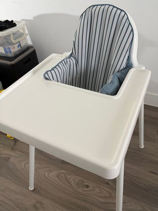 Trona de la marca IKEA, ideal para las comidas de los más pequeños. - Color gris claro. - Bandeja integrada. - Patas estables.