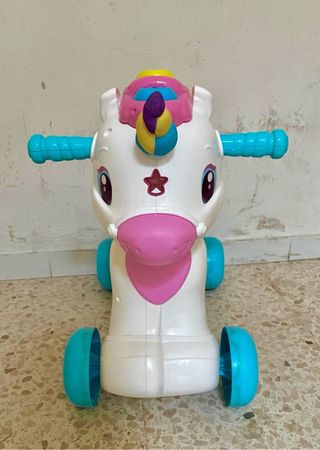 Balancin / Andador de unicornio interactivo, con canciones y ritmos infantiles. Tres modalidades de juego diferentes: como acunador, como correpasillos, como centro de actividades. Y también en inglés. Esta como nuevo.