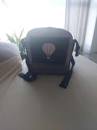 Bolso-Trona de viaje infantil, portátil, marca Jane, como Nueva. Ideal para llevar de fin de semana, vacaciones, pasar el día, comer fuera de casa. Apenas usada (conserva aún un precinto). Estructura interior rígida. Muy completa, adaptable mediante correas ajustables y velcros. Gran capacidad en base, cajón duro, puedes meter tupper, cubiertos, baberos, pañales, etc.Dos bolsillos laterales con cremallera y otros dos pequeños sencillos. Bonito color beige, crema en combinación con dibujos de animales en tonos naranjas, azul, verde, marrón. Fácil transporte con correa para llevar en la mano o colgar del hombro, carrito o sillas paseo
