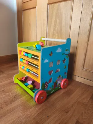 Andador de madera con múltiples actividades para el desarrollo infantil. Ideal para que los más pequeños aprendan y se diviertan. - Incluye ábaco con cuentas de colores. - Formas geométricas para encajar. - Números del 1 al 10. - Diseños de animales y vehículos. -Pizarra