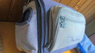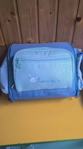 Trona portátil con un diseño infantil y divertido. - Color azul y verde menta. - Estampado de puntos y un tierno conejito. - Cremallera frontal con tirador en forma de estrella.
