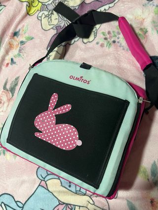 Bolso de transporte para trona portátil de la marca Olmitos. Presenta un diseño infantil con un simpático conejito rosa de lunares blancos sobre fondo negro. - Color principal: fucsia y verde menta. - Correa ajustable para colgar. - Cierre de cremallera.