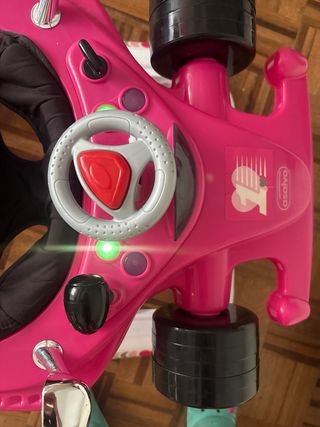 Caminador para bebés con diseño de coche de carreras. - Color rosa vibrante. - Asiento acolchado. - Volante interactivo. - Botones con luces y musica - Ruedas resistentes.