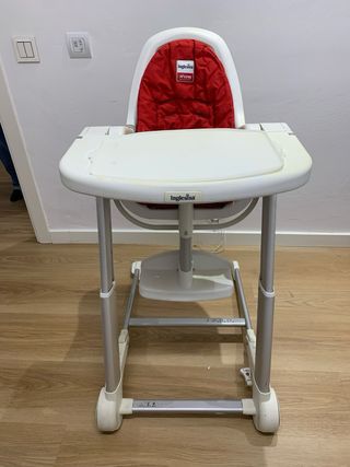 Trona de la marca Inglesina, ideal para bebés. - Color blanco y cojín rojo. - Bandeja extraíble. - Ruedas para facilitar el movimiento . En buen estado.