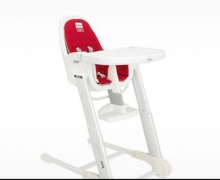 Trona de la marca Inglesina, modelo ZUMA, en color blanco y rojo. Usado con una sola niña. - Asiento acolchado, desenfundable, con cinturón de seguridad. - Bandeja extraíble, para fácil limpieza. - Estructura metálica. plegable y regulable el altura. Diseño moderno.