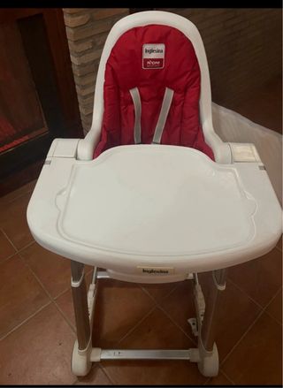 Trona de la marca Inglesina en color rojo. Perfecta para las comidas de los más pequeños. - Diseño acolchado. - Etiqueta de la marca visible. con bolsillo para guardar baberos. Super cómoda y muy facil de desmontar y lavar. Mi hija la ha usado hasta los 3 años y medio. Tiene algunas marcas del uso ( se ven en fotos).