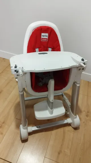 Trona de bebé de la marca Inglesina, ideal para las comidas. - Color rojo y blanco. - Bandeja extraíble. - Arnés de seguridad.