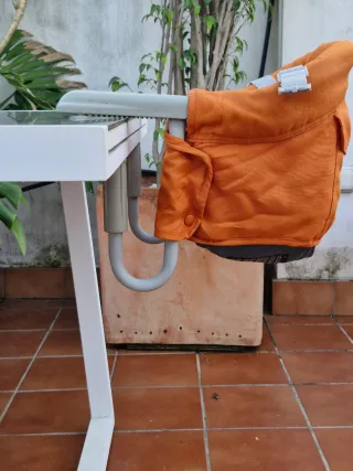 Trona de la marca Inglesina, ideal para los más pequeños. - Color blanco y naranja. - Asiento acolchado. - Bandeja extraíble. Solo el velcro interior esta gastado, ver foto, aunque todavía hace su función