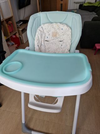 Trona Jane Mila en color menta, ideal para las comidas de los más pequeños. Es cómoda y segura. - Asiento acolchado. - respaldar reclinable horizontal para siestas. - reductor acolchado, que se quita. - Arnés de seguridad de 5 puntos. - Bandeja extraíble. - Reposapiés movible a dos alturas - Estructura plegable para un fácil almacenamiento. tiene una zona interior descosida, pero puesto no se ve. goma para ajustar la zona baja sin elástico. ver fotos. precio original 150€. recoger en sanchinarro