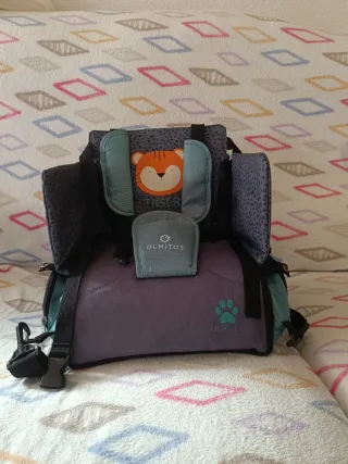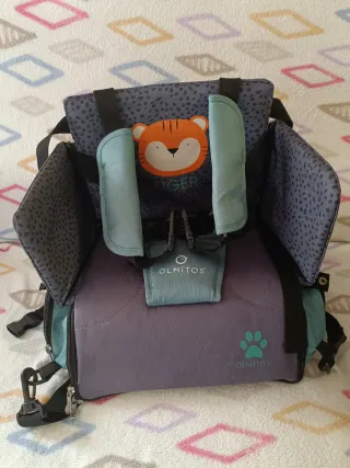Asiento elevador plegable de la marca Olmitos, ideal para llevar a todas partes. Diseñado para bebés a partir de 6 meses. - Plegable y ligero. - Compartimento interior. - Diseño con estampado de tigre. Sin usar