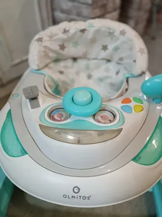 Andador para bebé de la marca Olmitos, con un diseño divertido y colorido. - Asiento acolchado. - Bandeja de actividades. - Ruedas giratorias.