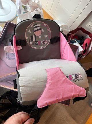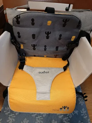 Trona de viaje plegable de la marca Olmitos. Es compacta y fácil de transportar. Se fija con correas al respaldo y al asiento de la silla. Recogida zona metro arturo soria. Será preciso lavarla, la funda es desmontable.