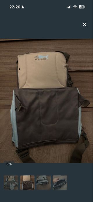 Trona portátil de la marca Olmitos, ideal para llevar a cualquier parte. Su diseño es moderno y funcional. - Color azul. - Estampado de soles y lunares. - Incluye etiqueta de la marca. Se puede llevar como mochila, tiene almacenamiento y dos compartimentos térmicos a los laterales. Se ha usado media docena de veces asi que esta como nueva