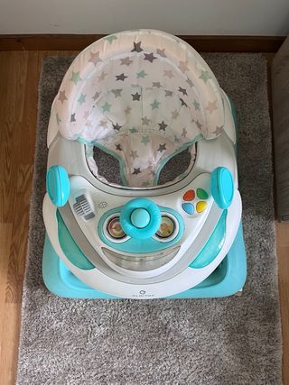 Andador para bebés con diseño moderno y divertido. - Estructura de plástico resistente en color blanco y turquesa. - Asiento acolchado con estampado de estrellas. - Bandeja de juegos con diferentes elementos. - Ruedas para facilitar el desplazamiento.