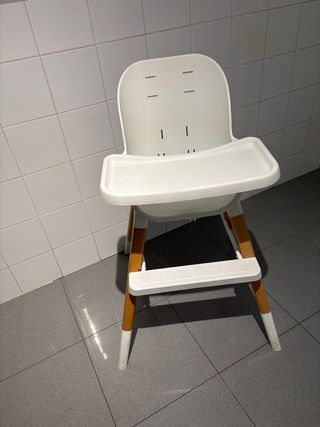 Se convierte en trona alta, trona baja, el asiento se extrae para colocar sobre una silla convencional, tambien se convierte en taburete alto. Bandeja extraible con funda de silicona antideslizante y arnes. En buen estado, solo necesita un buen lavado. Se entrega en mano en la caja original