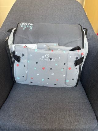 Asiento elevador plegable de la marca Olmitos, con un divertido estampado de estrellas. - Diseño plegable para facilitar su transporte y almacenamiento. Se puede llevar tanto como mochila como bandolera. - Acolchado para mayor comodidad. - Arnés de seguridad de 5 puntos. - Estampado de estrellas en tonos grises, rojos y azules. - Con compartimentos laterales y central.