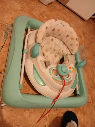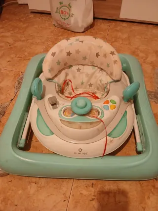 Andador para bebés de la marca Olmitos, en buen estado. - Color: verde menta y blanco. - Diseño con estrellas en el asiento. - Bandeja de actividades con juguetes. - Ruedas giratorias para facilitar el movimiento. Precio negociable Hay que lavarlo un poco pero no hay ninguna mancha que no se pueda quitar. Por lo demás todo genial mi bebé solo lo uso 3 veces contadas.