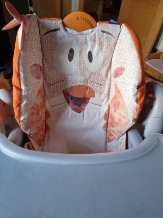 Trona evolutiva y plegable con un divertido diseño. La funda de de gallina esta bastante desgastada, abría que cambiarla; pero lo que es el chasis esta en perfecto estado. - Estructura de plástico y metal. - Patas con detalles naranjas.