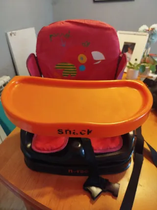 Silla alzador Olmitos para niños, ideal para usar en restaurantes o de viaje. Es plegable y fácil de transportar. Se encuentra en buen estado, aunque con algunas señales de uso. - Plegable y portátil - Marca Olmitos - Incluye correas de sujeción Está algo sucio, pero se limpia sin problema, no tiene mucho uso.