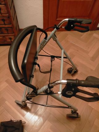 Andador de acero con empuñaduras azules, diseñado para ser plegable. - Estructura de acero. - Empuñaduras de color azul. - Diseño plegable para facilitar el almacenamiento y transporte. Usado en pocas ocasiones, está como nuevo. Se han añadido unas ruedas en las patas de apoyo.