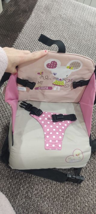 Preciosa trona portátil para bebé, ideal para llevar a cualquier parte. Se encuentra en muy buen estado. - Plegable y fácil de transportar. - Bandeja incluida. - Cinturones de seguridad.
