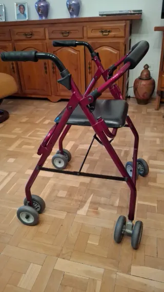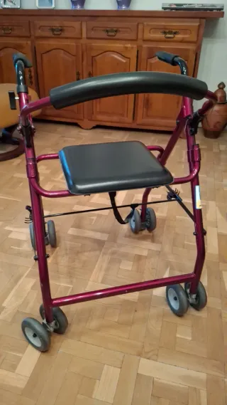 Andador plegable de color granate, ideal para facilitar la movilidad. - Asiento acolchado. - Ruedas delanteras para un desplazamiento suave. - Empuñaduras ergonómicas Precio a convenir
