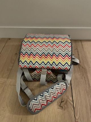 Práctica trona portátil para bebés, ideal para llevar a cualquier parte. Su diseño colorido y divertido la hace muy atractiva. - Estampado de zig-zag multicolor. - Correas de hombro acolchadas y ajustables.