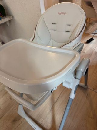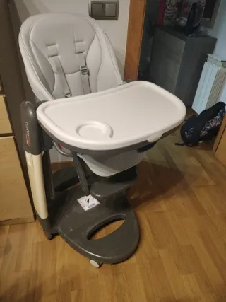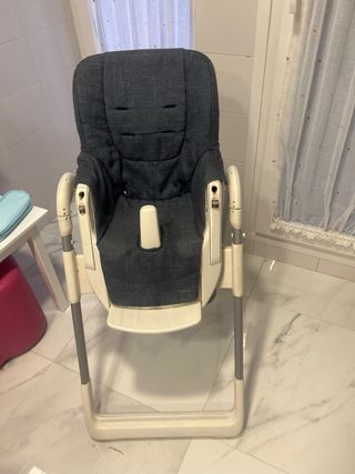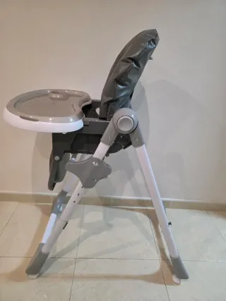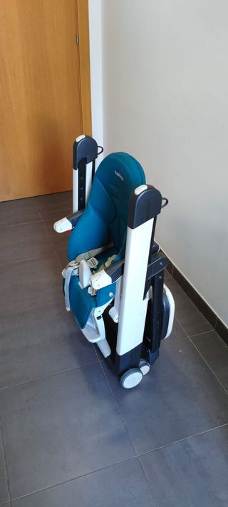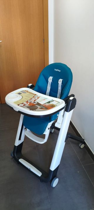 Trona Peg Perego en perfecto estado, casi sin uso. Es muy práctica y se adapta a las necesidades del bebé. - Altura regulable. - Asiento reclinable. - Bandeja extraíble. - Doble bandeja comer/jugar. - Asiento acolchado. - Ruedas en parte posterior. - Plegable para guardarla fácilmente.