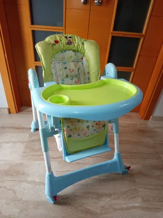Trona con ruedas en la parte posterior. Tiene asiento reclinable en distintas posturas. Esta usada. Le falta en un lareral el enganche y la bandeja está arañada. Tiene la altura regulable