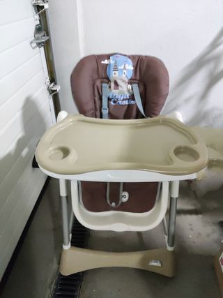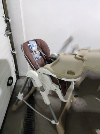 Trona en perfecto estado, regulable en altura,desmontable,respaldo reclinado, bandeja extraible y ajustable en distancia.