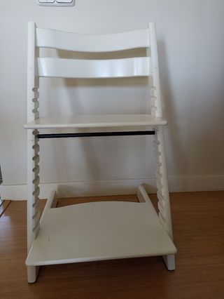 Silla alta Stokke en color blanco. Stokke Tripp Trapp - Diseño ergonómico. - Asiento y reposapiés ajustables. Es del 2017 , tiene marcas de uso pero tiene mucha vida todavía!