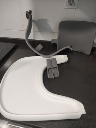 Bandeja y kit de seguridad para la trona Tripp Trapp de Stokke. Piezas originales. - Bandeja de plástico blanco. - Baby set gris. Prácticamente nuevo Se puede vender por separado