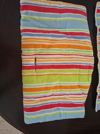 Funda original para trona Stokke con un diseño de rayas multicolor. - Diseño de rayas vibrantes en rojo, naranja, verde, azul y blanco. - Material suave y cómodo.