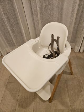 marca stokke original, bandeja en blanco, silla, un juego de almohadas, tacos para las patas, tirantes y plato- mantel autoadhesivo