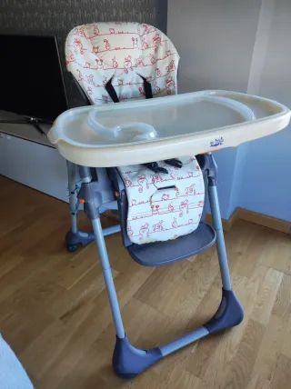 Trona Chicco Polly en color gris y blanco con estampado de animales. - Asiento acolchado. - Arnés de seguridad. - Plegable para fácil almacenamiento. La almohadilla tiene alguna rotura del uso pero cabe la posibilidad de poner una funda.