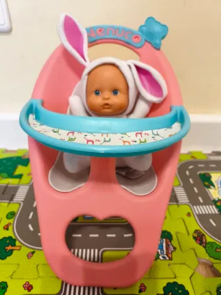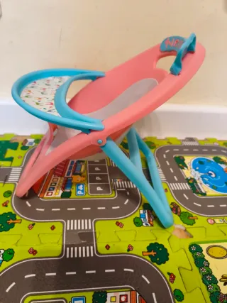 Trona de juguete de la marca Nenuco, ideal para muñecas. - Diseño en color rosa. - Bandeja con estampado de animales. - Muy poco uso.
