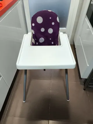 Trona IKEA en perfecto estado, con funda de Amazon acolchada. - Estructura blanca. - Funda morada con lunares blancos.