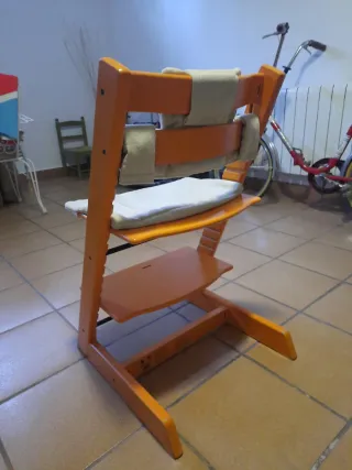Trona Stokke en color naranja, con cojín incluido. - Cojín de asiento y respaldo. - Estructura de madera.
