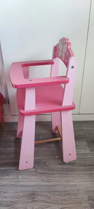 Trona de madera para muñecos, ideal para jugar. - Color rosa. - Diseño con mariposa en el respaldo. - Estructura de madera resistente. No tiene ningún desperfecto. Tengo también una cuna-litera a juego. Pack completo 30€.