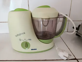 Robot de cocina Babycook de la marca Beaba, ideal para preparar comida para bebés. Su diseño combina tonos crema y verde. - Incluye jarra de cocción. - Tapa con cierre de seguridad. - Base con controles. - Cable de alimentación.