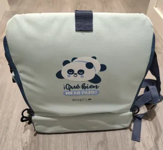 Trona portatil acoplable a cualquier silla con respaldo, incluye bolsa nevera extraíble para la conservación de alimentos, bolsillos laterales isotérmicos, correa para su transporte. Es muy práctica, cómoda y segura.