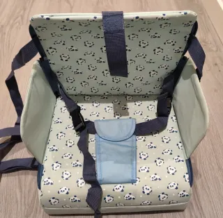 Ideal para ir a comer fuera de casa. Tiene asa para facilitar el transporte, se acopla a todas las sillas, textil de alta densidad, respaldo de 25cm, arnés de seguridad y bolsillo incorporado. Pesa 0.75kg. sólo se ha usado una vez. con su caja en perfecto estado