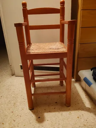 Silla alta de madera con asiento de esparto, ideal para los más pequeños. Su diseño clásico la hace un complemento perfecto para cualquier hogar. - Estructura de madera. - Asiento tejido de esparto. - Reposabrazos curvos.