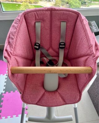Trona ergonómica para bebé, altura regulable (posición más alta 100cm), viene perfecto para la mesa de barra. Tiene mesita que se puede quitar si queréis que el niño/la niña coma en la misma mesa con vosotros. Arnés de 3 puntos, se regala el cojín de color rosa.